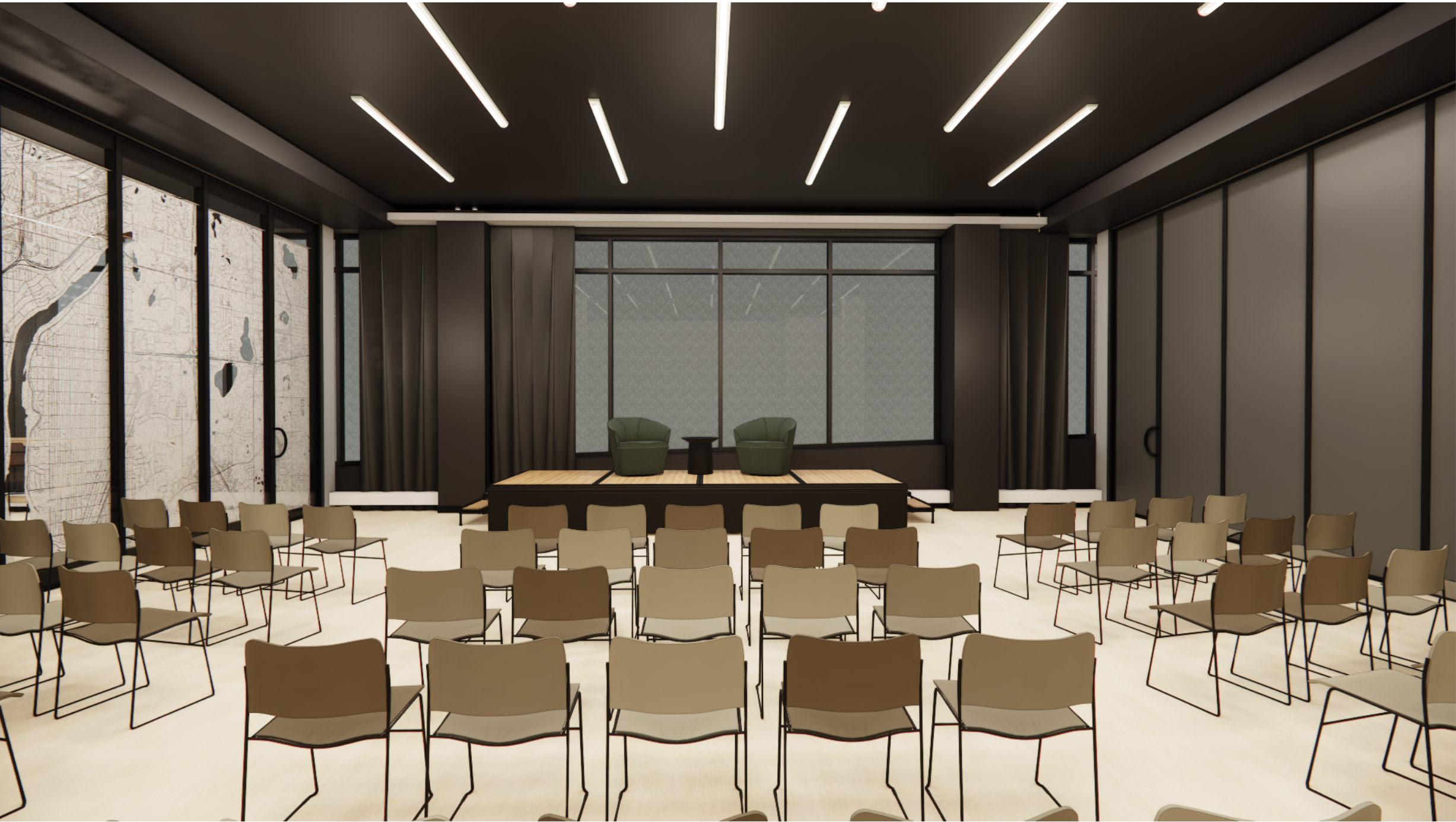 A modern, mission-aligned space with modular, adaptable, tech-forward rooms for meetings, workshops, and performances, prioritizing nonprofit, civic, and community partners while supporting community operations and programs.
